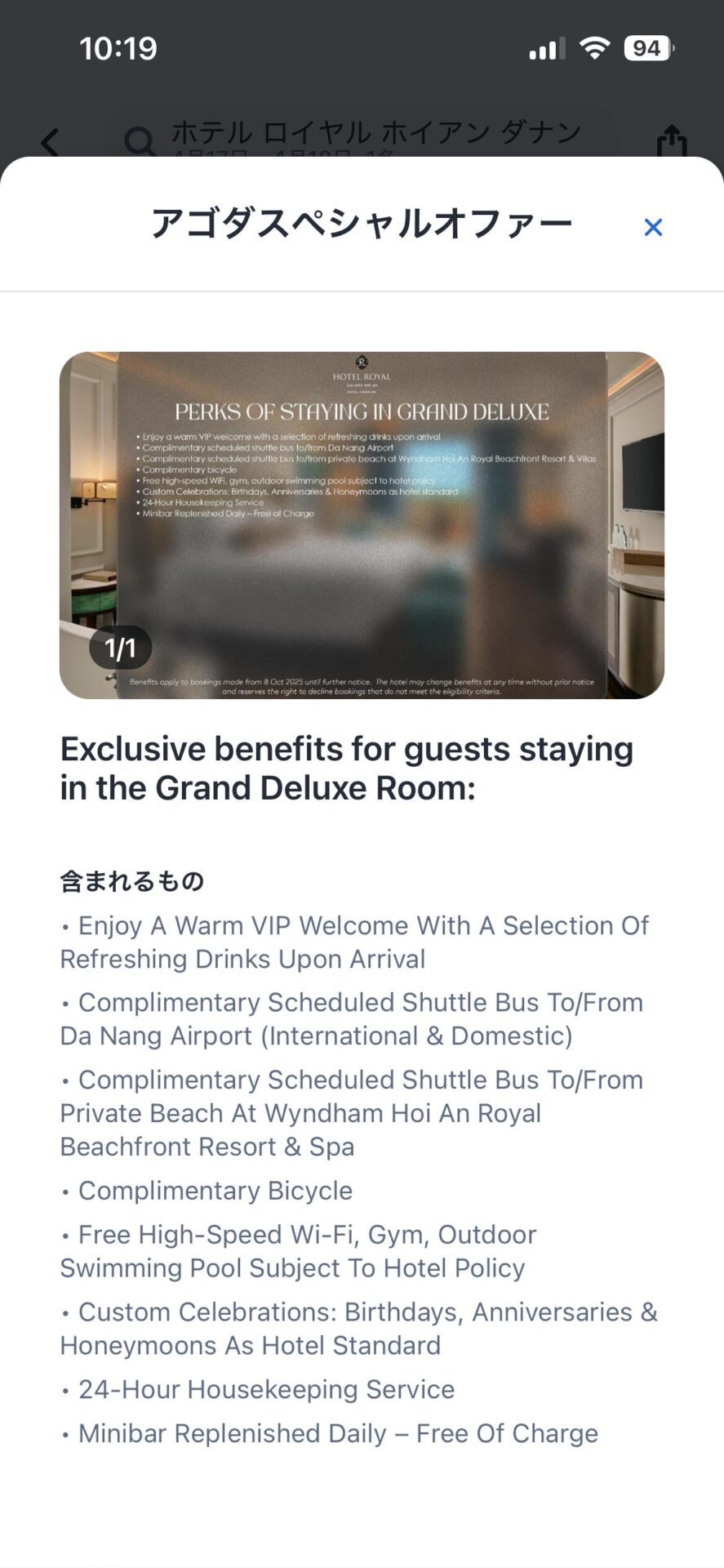 私はagodaのVIP会員なので予約時になにやらいろいろ特典が書かれていましたが、どこまでが限定特典なのかはわかりませんが、こんな感じの内容でした。ご参考までに♪